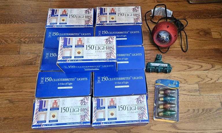 11 boxes of Clusterbrite electric string lights, bulbs, adapter, lighted Christmas ball decoration.