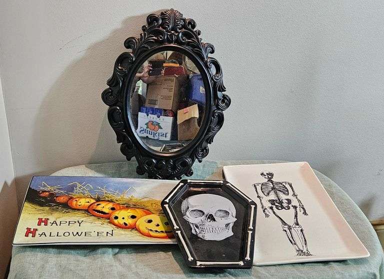 2 Williams Sonoma Platters, Sourpuss skeleton platter, electronic Halloween mirror decoration. Largest platter measures 16x10 inches. Mirror, 19x13 inches.