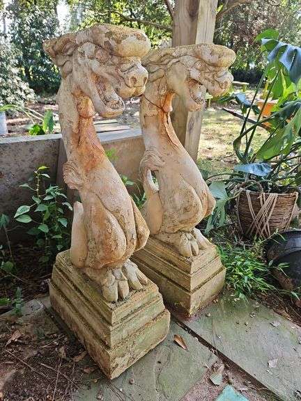 Have cracks and discoloration on surface. One has a broken tail. 34" x 15" x 9"