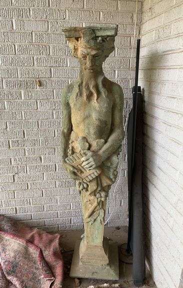 Cement statue of Bacchus/pan pipe player. Very heavy. Must bring help. We cannot help load. 12.5x12.5x59. Flat on top for plant etc.