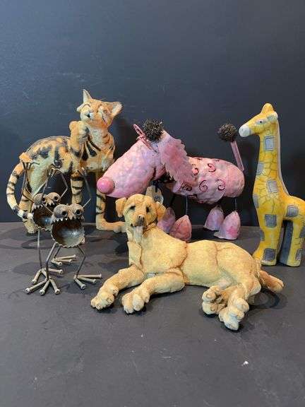 5 animals including dog, cat, giraffe, gremlins and poodle. Gremlins are metal. Dog is A Breed Apart and made by Country Artists Ltd 2002. Giraffe is glazed ceramic. Cat is A Breed Apart by Country Artists 2004. Pink poodle is marked Posey.