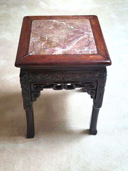 LOT 52 - Antique Asian Hand-Carved Clawfoot Side Table With Inset Marble Top