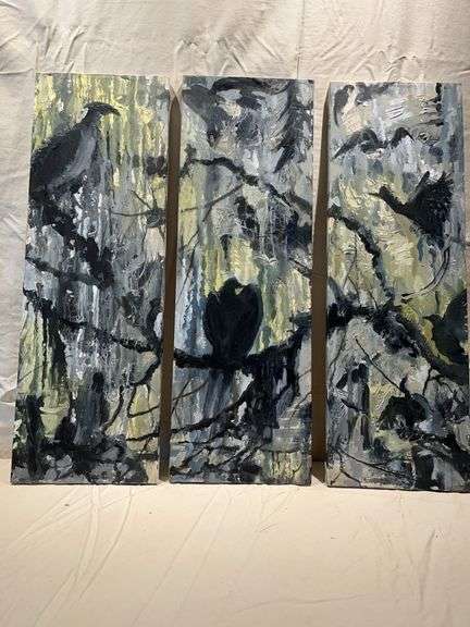 Oil on canvas painting triptych of birds by local artist J. William Hill. Art will be signed