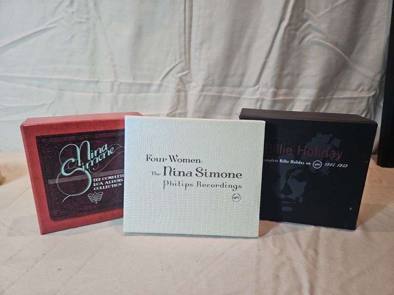 Clothbound 'The Complete Billie Holiday on Verve' CD box set and book. Some loose threads on cover. The Nina Samone Philips Recordings box set and book. Nina Samone Complete RCA Collection box set.