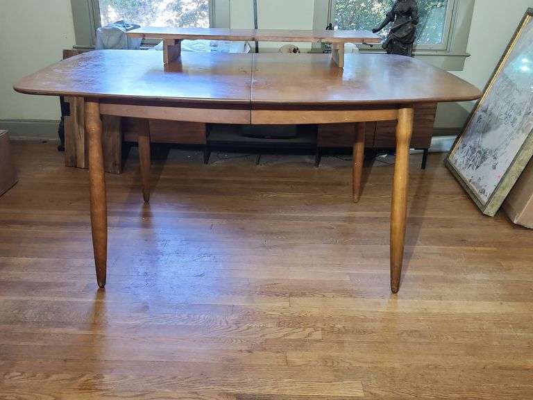 60"W x 40"D x 29"H w/o 2 leaves, additional leaves are 12" each, making the table 84"W with the leaf in. Cornet Ball MCM Dining Table. Matching chairs in Lot 93. Top needs some TLC, see photos.