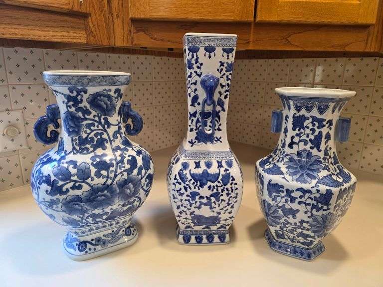 Three Blue and White Chinoiserie vases, all vintage Bombay Co, 18", 16" 14"