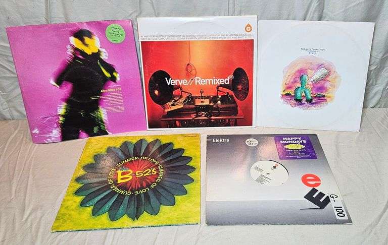 Verve record set has 3 vinyls in great condition. Jazz standards remixed by studio djs. Electribe 101 record comes inside a poster. B52s is a 45 rpm. Others are 33