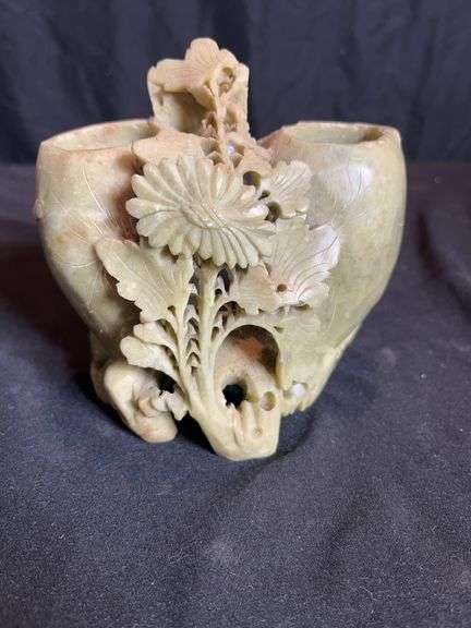 Soapstone is cool to the touch. Green with 2 vases embedded.