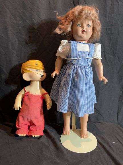 Composite doll on stand-no shoes. Dennis the Menace made of plastic. Doll 21” and Dennis 13”.