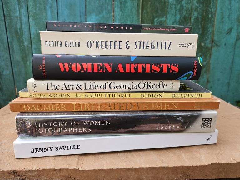 9 books about women in art. The Red Rose Girls, Daumier's Liberated Women, photography of women by Mapplethorpe, books about Georgia O'Keefe, Jenny Saville, and some collectives.