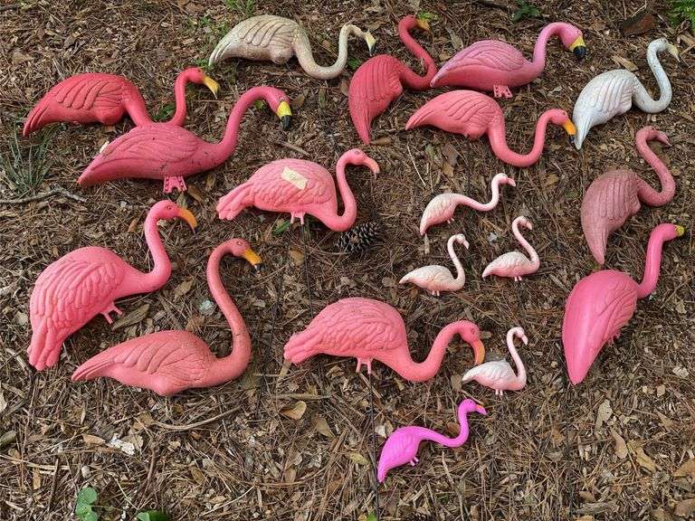 Description- Flock of flamingoes largest and small. Some legs are missing and they need a bath. White one had damage. Some marked Snomingo