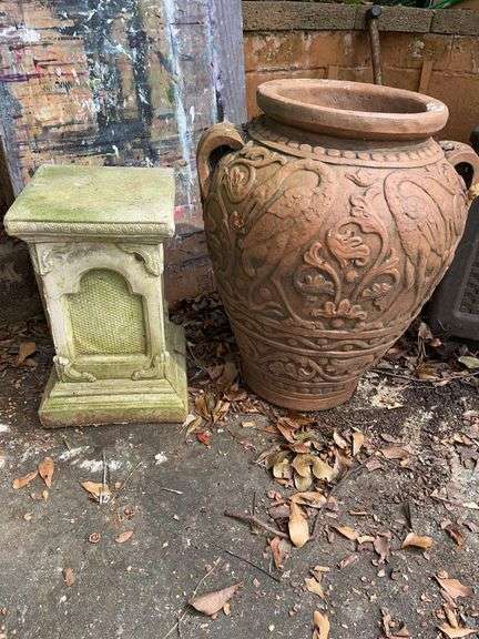 Large terra cotta pot 18x24”. Heavy. Cement pedestal 9.5x 10x 18”.$