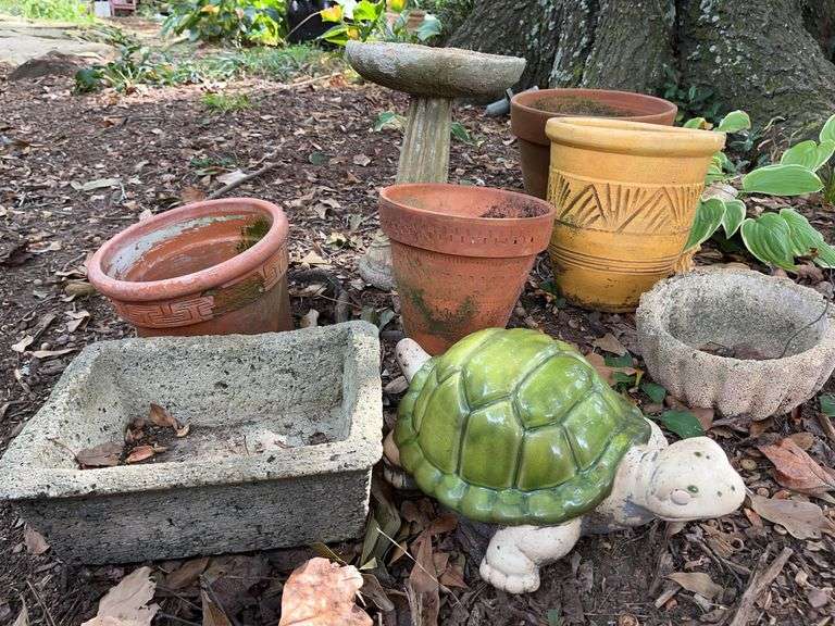 Concrete and terra cotta pots. Cement bird bath 10x14”. Ceramic turtle15” long.