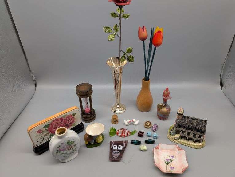 9" tall wood tulips in wood vase, 12" tall metal rose bud in silver-color vase, Jerusalem thimble, small glass beads and art, 2 1/2" x 2 1/2" tray, wooden pink sand clock, handmade genuine Jerusalem glass perfume bottle (broken rim) but has top piece, "January" British Traditions Burns' Reading Room by David Winter, and more.