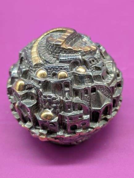 Silver plated sculpture showcases the iconic architecture of Jerusalem including its stone walls, domed roofs, and various buildings with gold accents. 2 1/2" diameter.