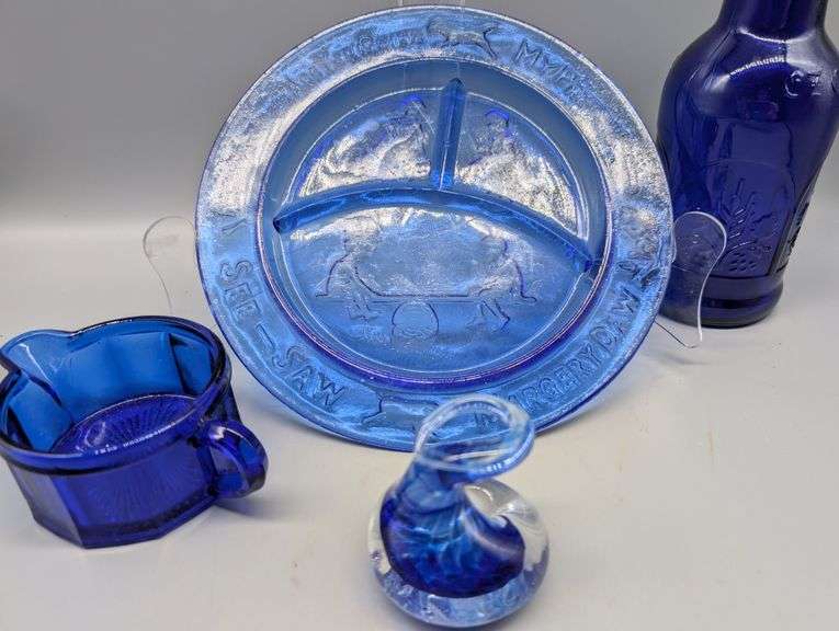 8 1/2" Margaret Daw nursery rhyme divided plate, 9 1/2" EZ Cap bottle with a swing top closure, 2 1/2" tall pen holder / paperweight, and 3 1/4" creamer.