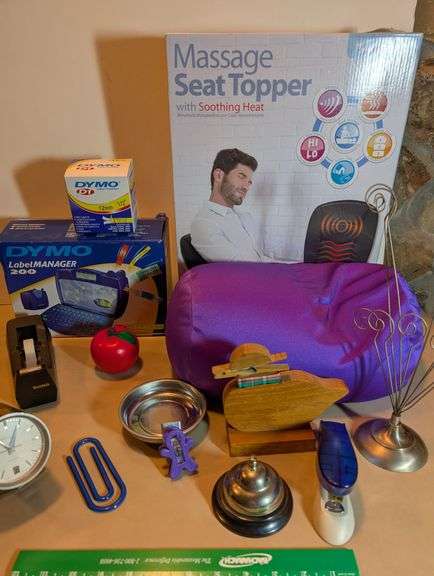 Contactor clock weighs over 2 lbs, DYMO label Manager 200 with box and label cassettes and instructions, Health Touch massage seat topper with heat and vibration, stapler, Scotch tape dispenser, magnetic tray for paper clips, holders for notes, back pillow, apple-shaped stress reliever, ruler, and more.