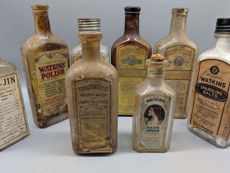8 jars kept by a descendant of the Earls family who sold Watkins products. Tallest is 8 1/2".