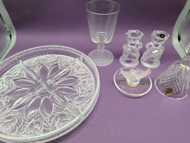 Pair of swan 24% lead crystal taper candle holders, 24% PBO lead crystal hand cut bell, Lalique frosted crystal "Deux Colombes" (two love birds) ring tray, Duncan & Miller "Three Face" pressed glass goblet, and 11" divided serving tray with frosted roses Stars and Bars.