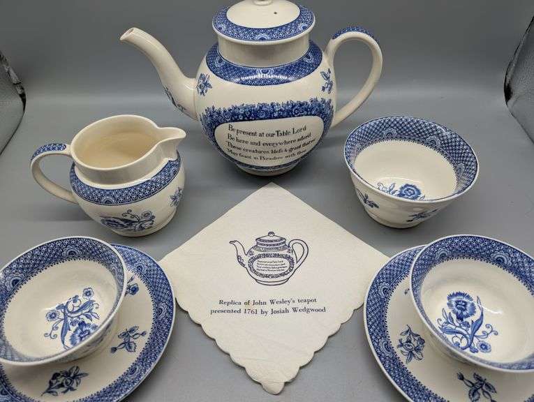 Replica of John Wesley's teapot presented 1761 by Josiah Wedgwood, teapot with lid, creamer, sugar bowl, 2 cups & saucers, and a napkin.