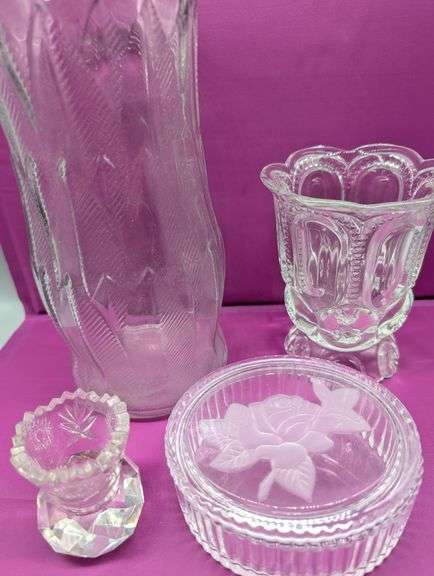 Cristal d'Arques glass trinket box featuring a frosted rose design on the lid, cut crystal toothpick holder, moon and star pattern scalloped edge spooner, and a 9 1/2" tall vintage vase featuring a feathered rib or dart pattern.