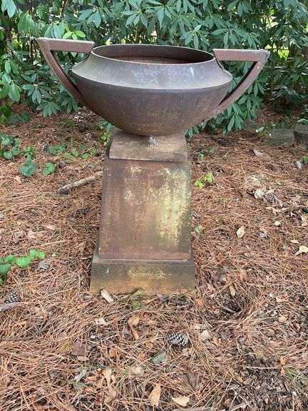 Metal art deco pot-very heavy. Metal stand has open space in the middle. Heavy. Pot 29x13” and base 18x18x24”.