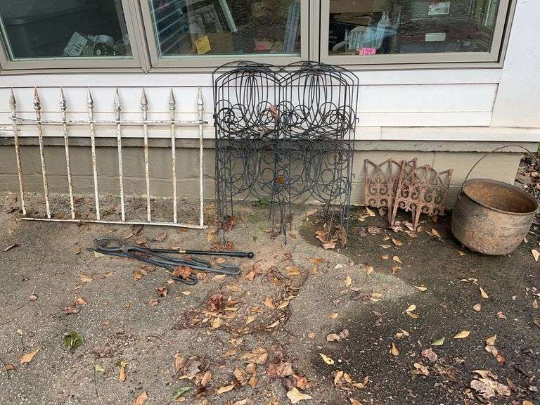 Iron picket, decorative fencing, fireplace tools, iron bucket, metal pieces.