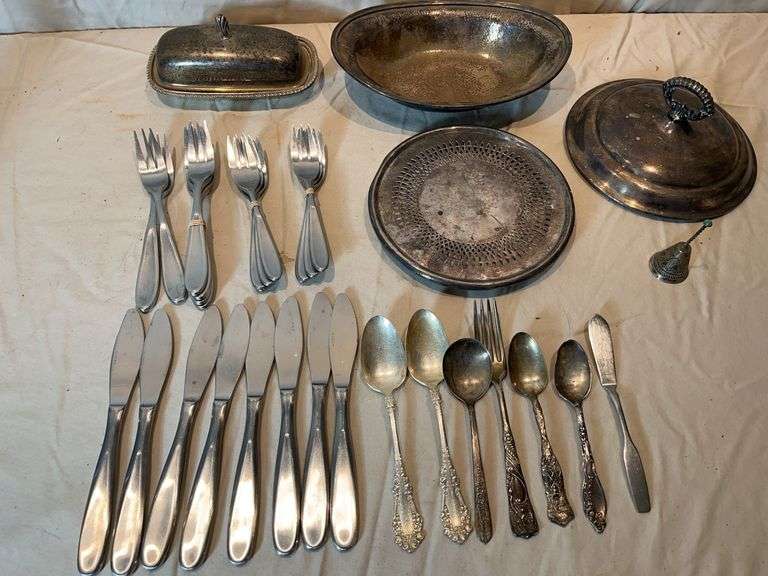 Reed and Barton bowl. Lid. Gotham trivet. Butter dish English silver plate.. Towle stainless steel flatware if 14 forks and 8 knives. Various flatware pieces.