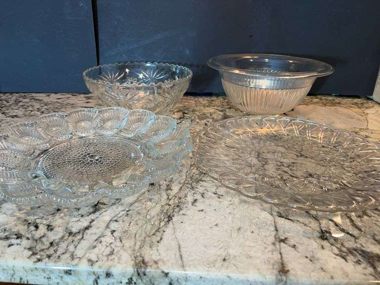 Fluted bowl listed as Vintage Hazel Atlas clear Federal Glass mixing bowl. Deviled egg dish and two pressed glass pieces.
