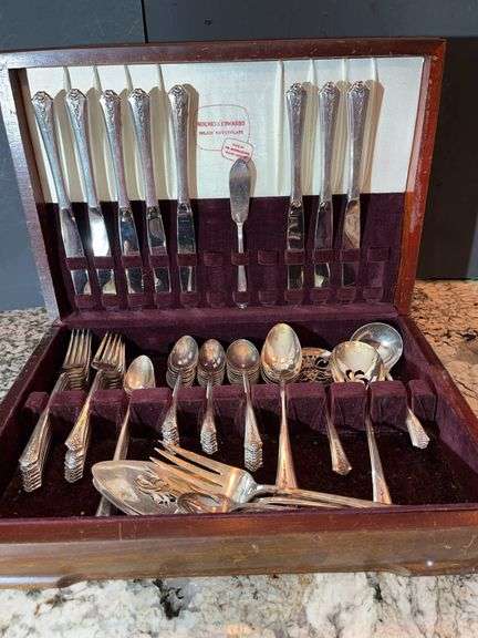 Wooden box contains Holmes and Edward’s silverplate pattern “Spring Garden.” Assortment of pieces.