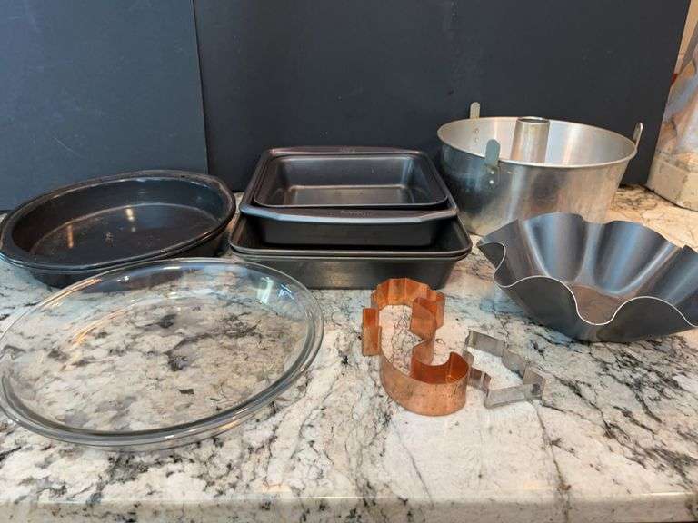 Glass Anchor Hocking plate, Wilton tins, Bakers Best pie pans, Wilton baking dishes. Sears cake pan.