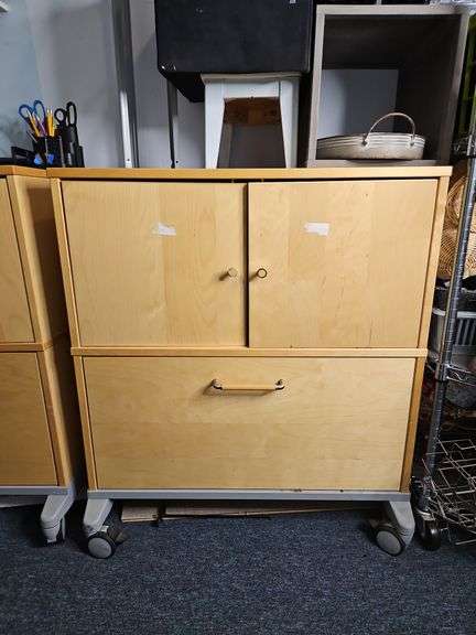 33x17x37. Ikea Cabinet on wheels with 2 units for storage. Has sticker residue, some scratches. Contents not included. Salon 2nd Floor hall