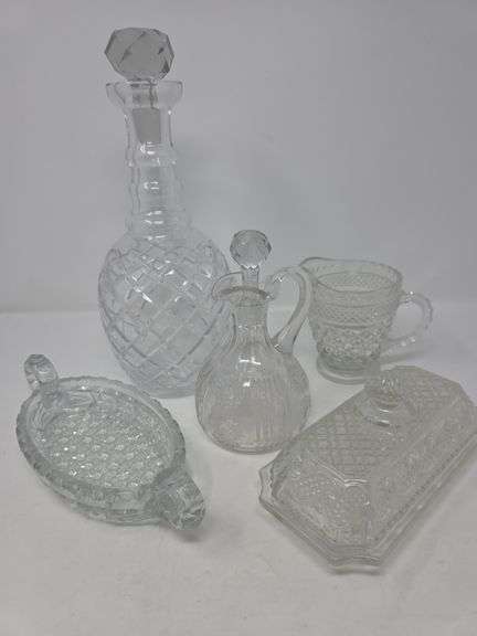 LOT 31 - Vintage and Antique glassware- Pitcher, Decanters, Butter Dish and Candy Dish